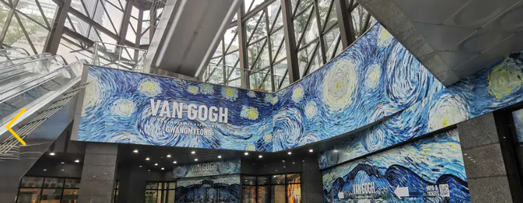벽 한쪽에는 반 고흐의 푸른색과 노란색이 어우러져 마치 별이 빛나는 밤하늘을 보는 듯한 대형 벽화가 방문객을 맞이합니다.